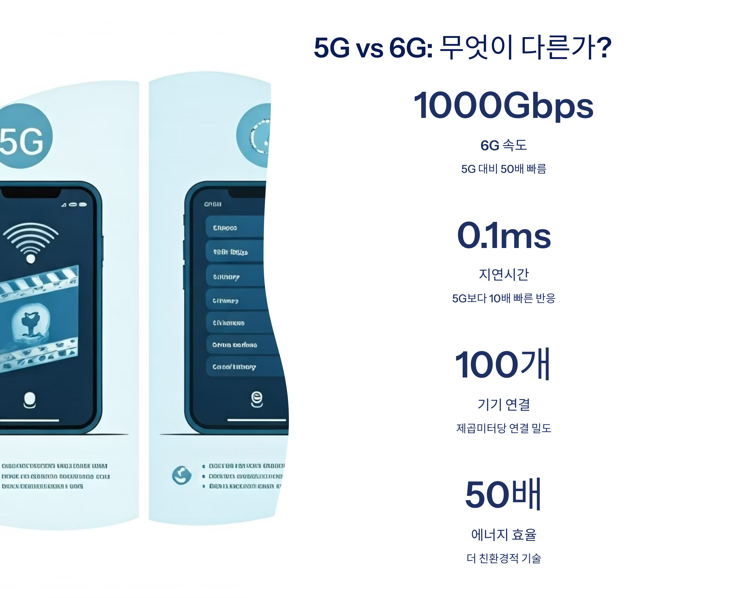 최대 속도 기준으로는 5G보다 50배 이상 빠르고, 지연 시간도 10배 더 짧아요. 체감 성능 차이는 훨씬 클 거예요.