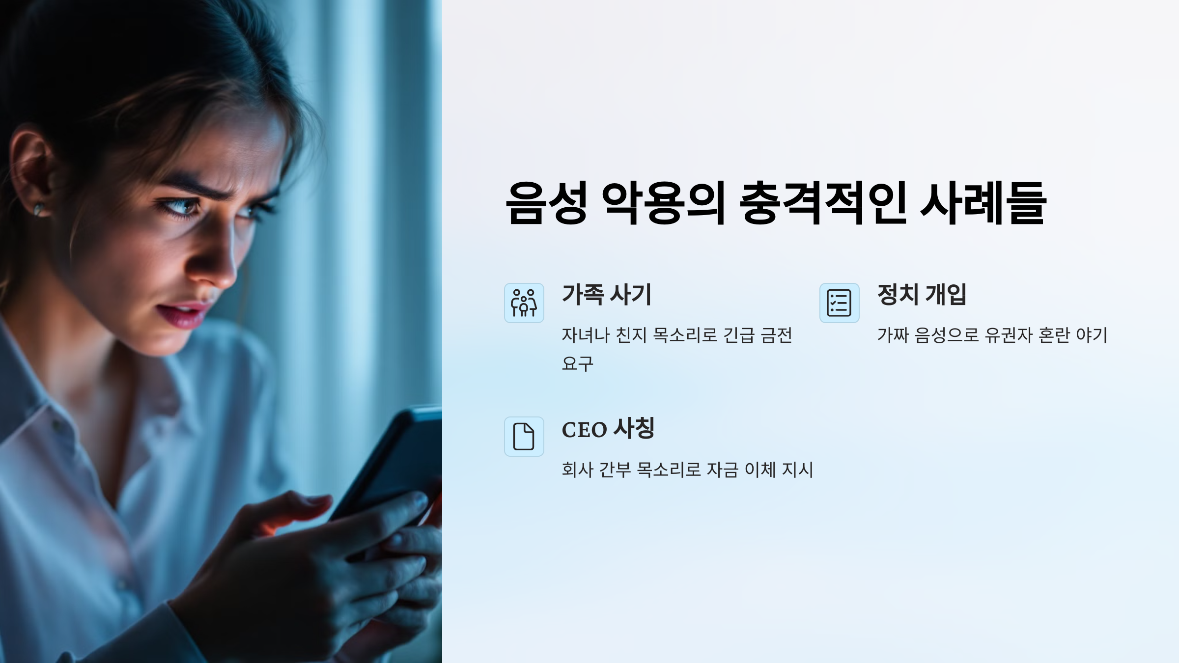 실제로 AI 음성 기술은 이미 다양한 범죄에 활용되고 있어요. 목소리만 듣고는 진짜인지 가짜인지 구별하기 어려워 더 위험하죠.