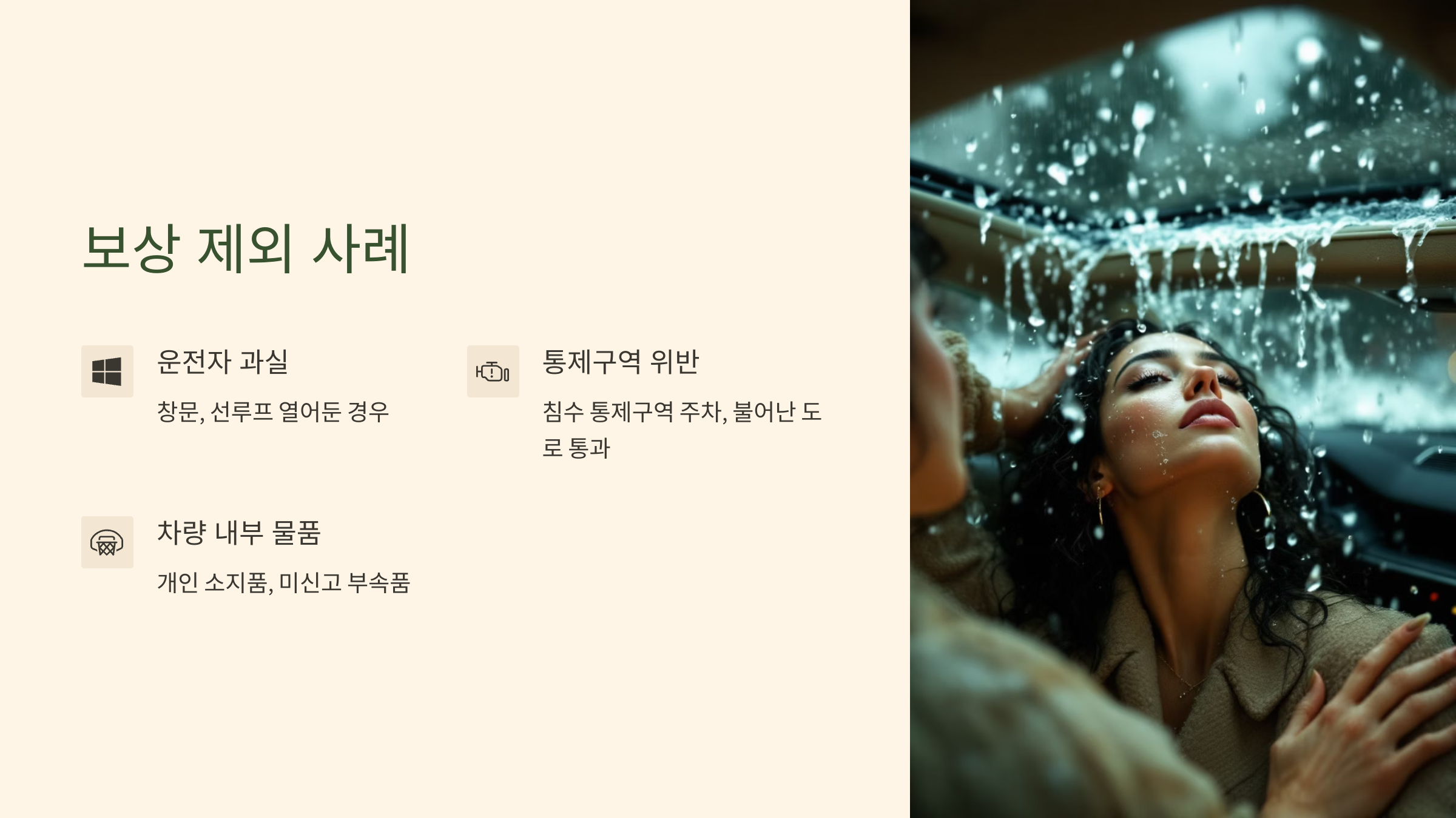 자동차 침수 피해가 무조건 보상되는 건 아니에요. 자차담보에 가입되어 있어도 상황에 따라 일부 보상에서 제외될 수 있어요. 다음 조건들을 꼭 확인해 보세요.
