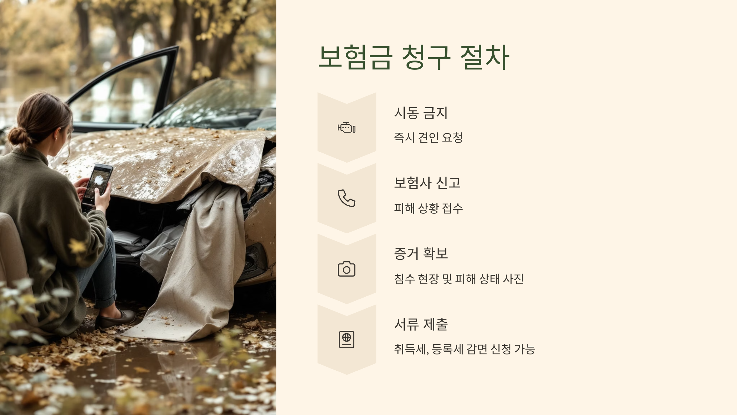 자동차가 침수 피해를 입었을 때는 빠르게 대응하는 것이 중요해요. 특히 사고 직후 사진, 영상, 상황 설명 자료를 확보해두면 보험사와의 분쟁 시에도 유리하게 작용할 수 있어요.