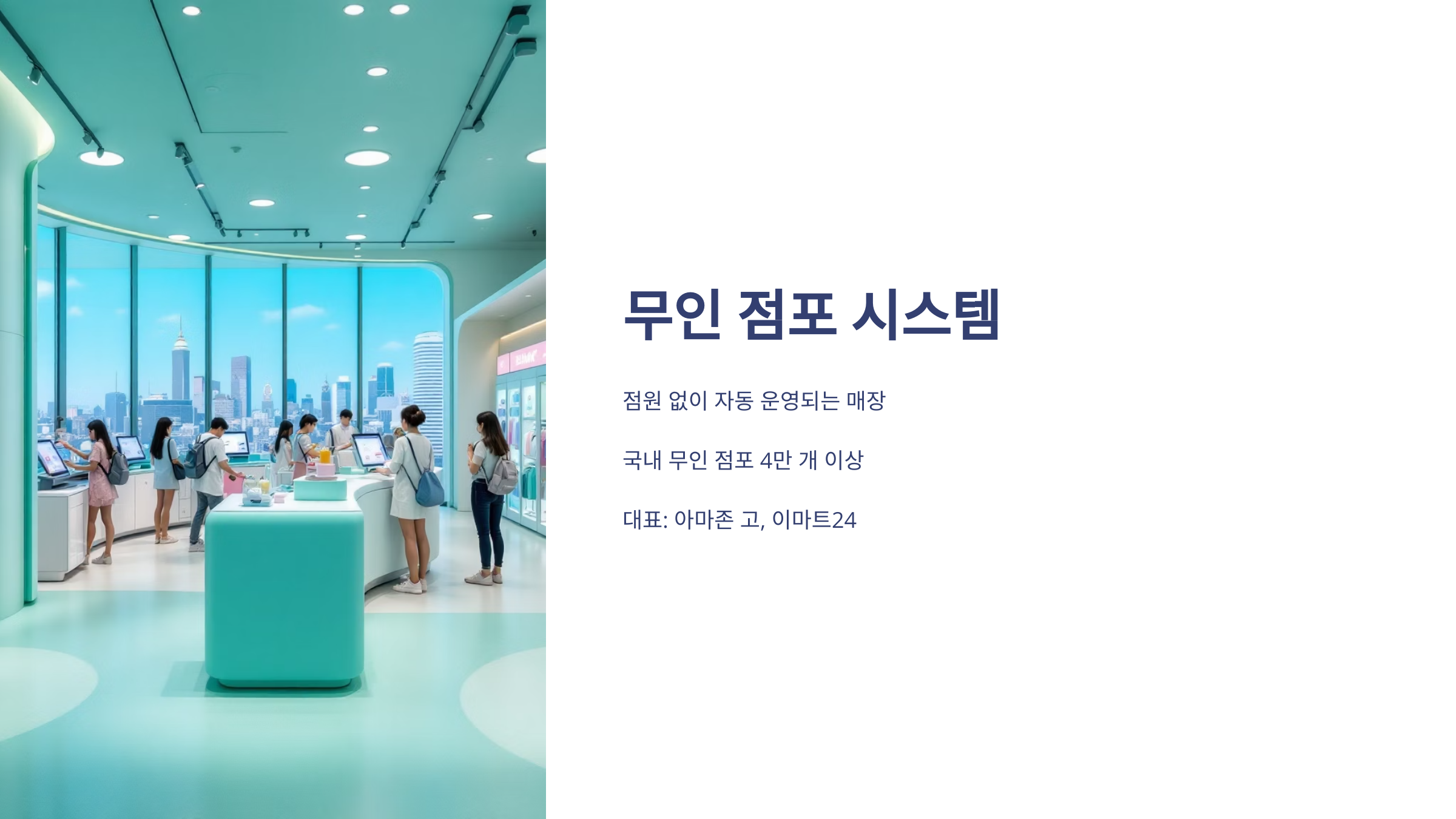 무인 점포는 말 그대로 직원이 상주하지 않고 고객이 스스로 상품을 구매하거나 서비스를 이용하는 시스템이에요. 최근에는 AI와 IoT, 안면인식, 무인결제 기술이 융합되며 더욱 고도화되고 있죠.