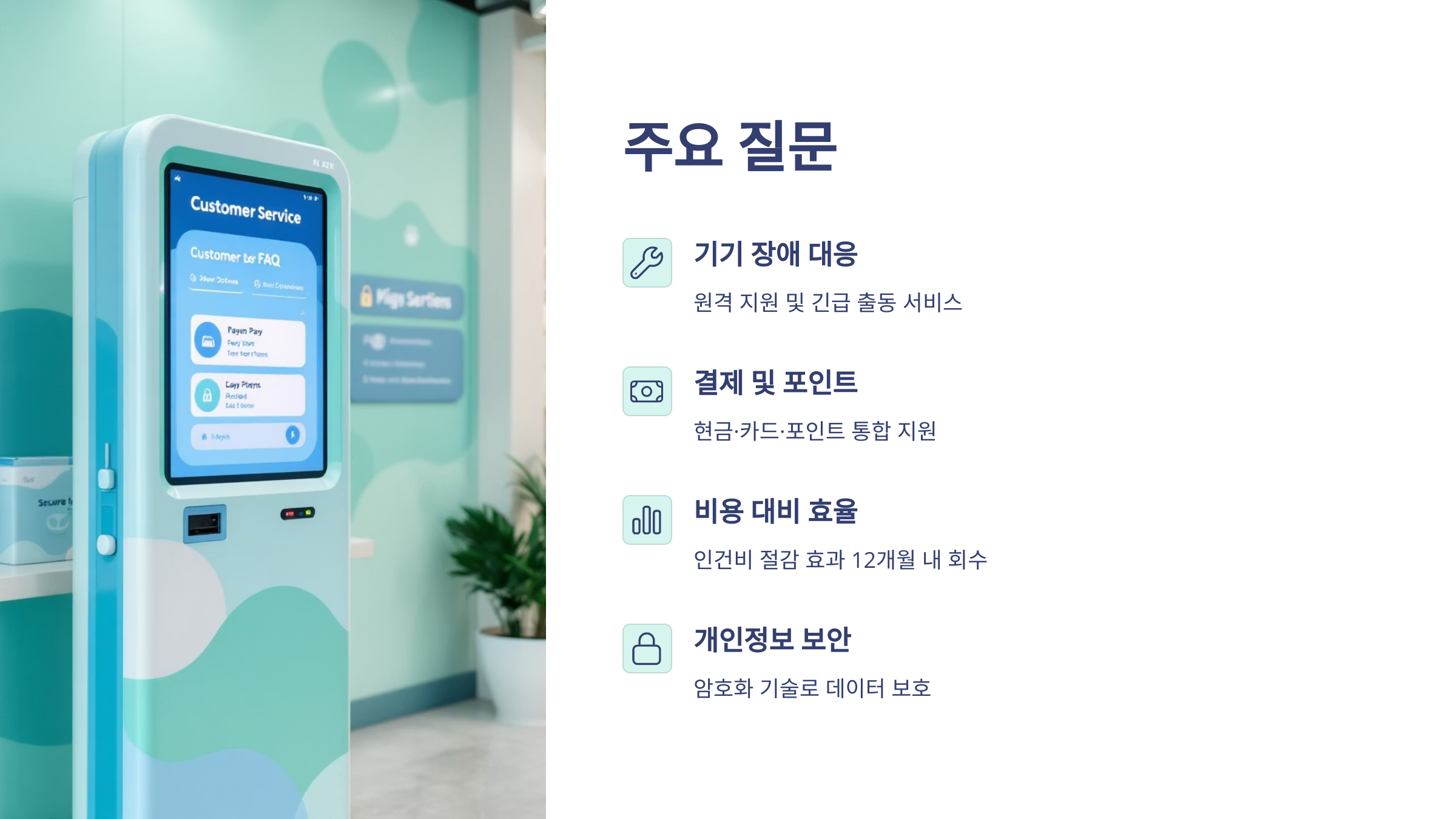 A2. 키오스크 1대당 약 300만~500만 원 선이며, 보안 시스템과 연동되면 1,000만 원 이상이 들 수 있어요. 장기적으론 인건비 절감으로 회수 가능해요.