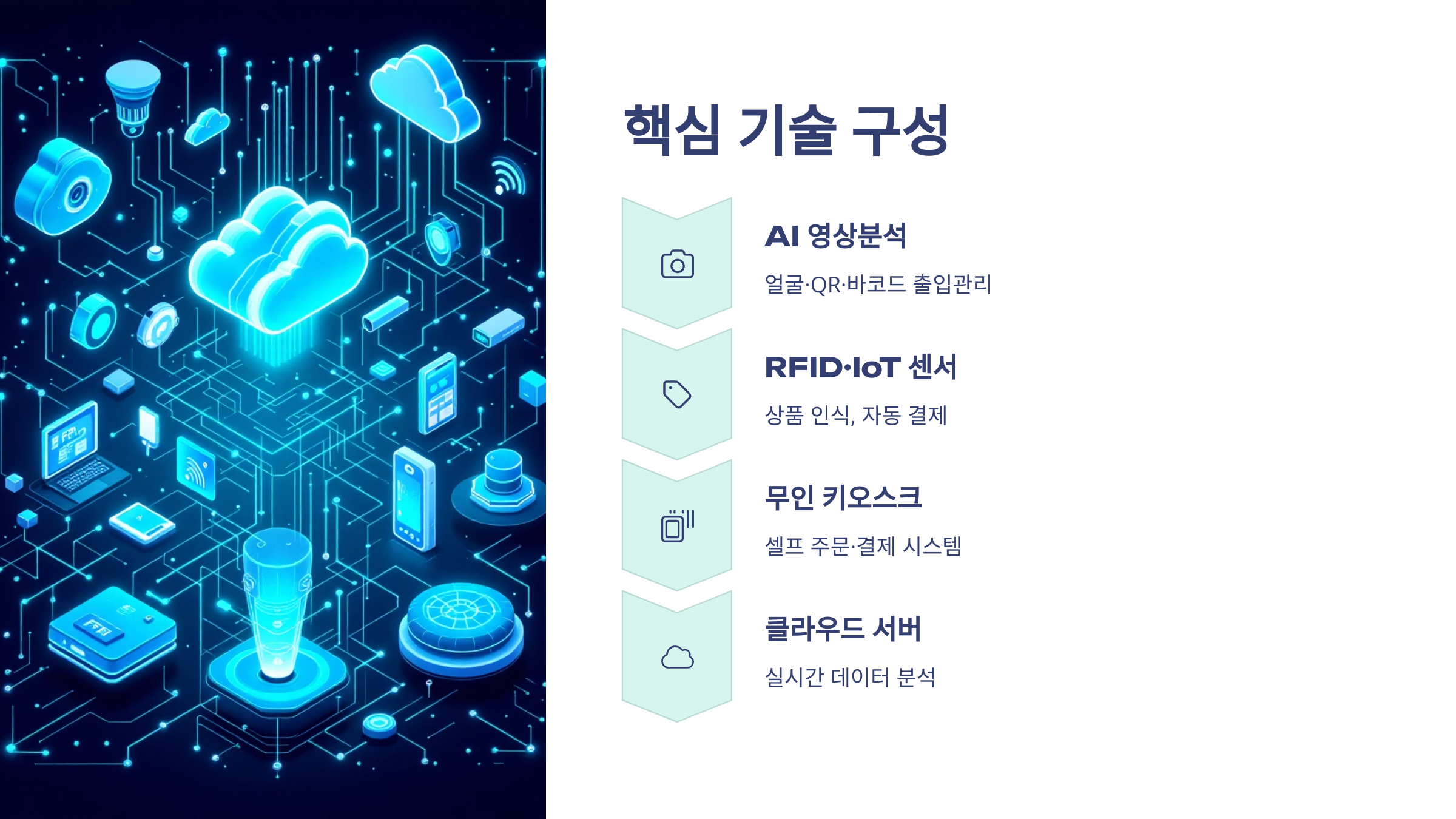무인 점포는 단순히 사람이 없는 공간이 아니라 정교한 기술 인프라로 운영돼요. 핵심 기술 요소는 다음과 같아요: