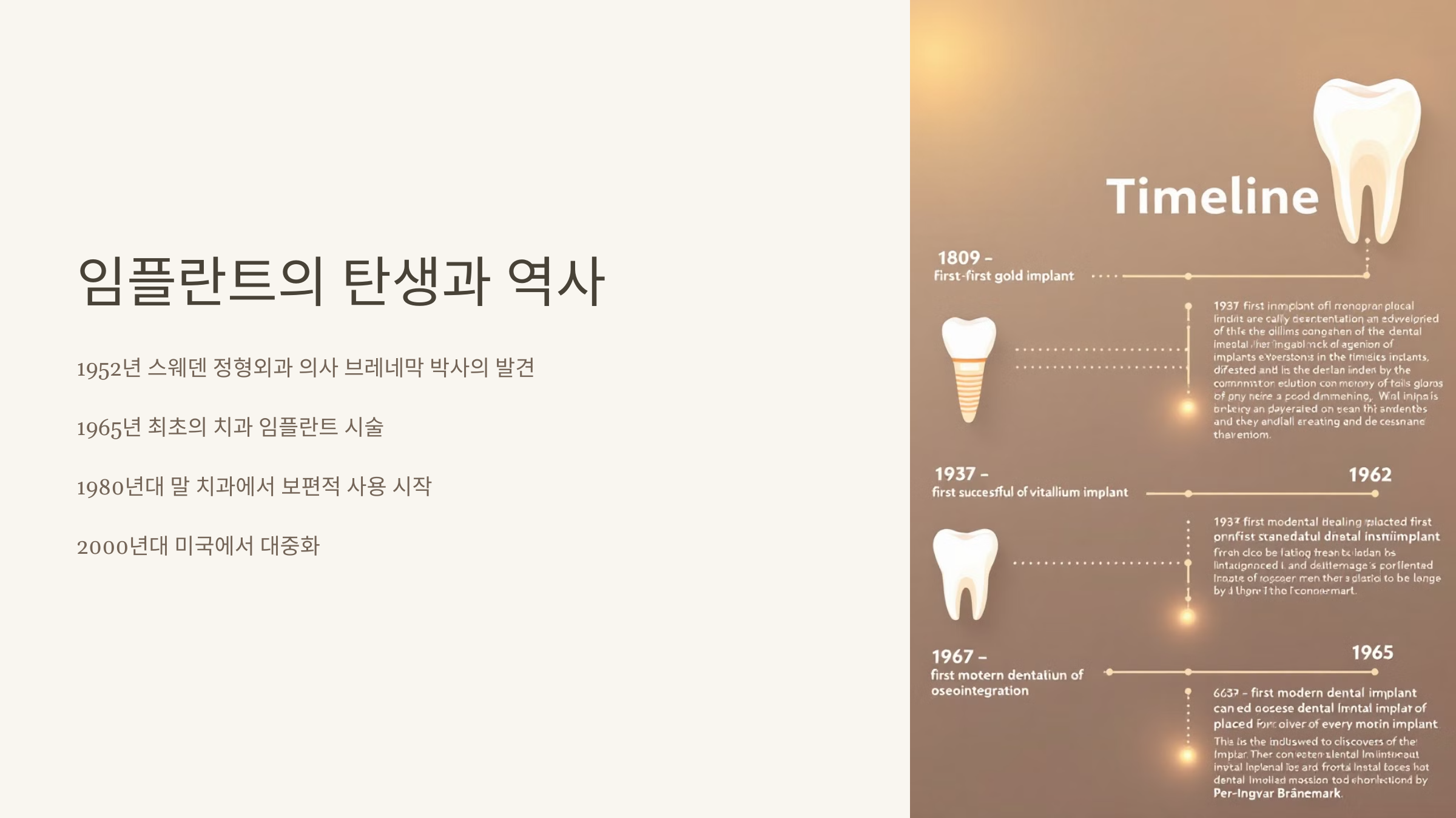 현대 임플란트의 전신은 1952년 스웨덴의 과학자 페르 브로네막이 티타늄이 뼈와 잘 결합하는 ‘골융합(Osteointegration)’ 현상을 발견하면서 시작됐어요. 그가 처음 사람에게 티타늄 임플란트를 시술한 건 1965년이고, 이 성공이 지금까지 이어지는 임플란트의 시작이었죠.