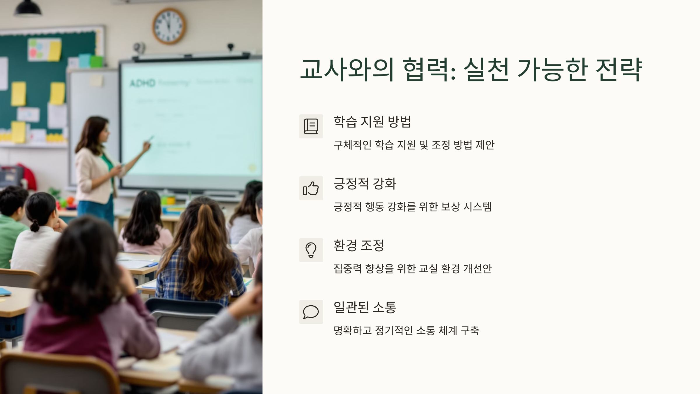 두 번째는 긍정적인 개입을 요청하는 거예요. 예를 들어, “과제를 작게 나눠주세요”, “눈 맞춤으로 지시해 주세요” 같은 요청은 교사가 현실적으로 실천할 수 있는 방법이에요. 행동을 수정하려면 작은 지원부터 시작해야 해요.