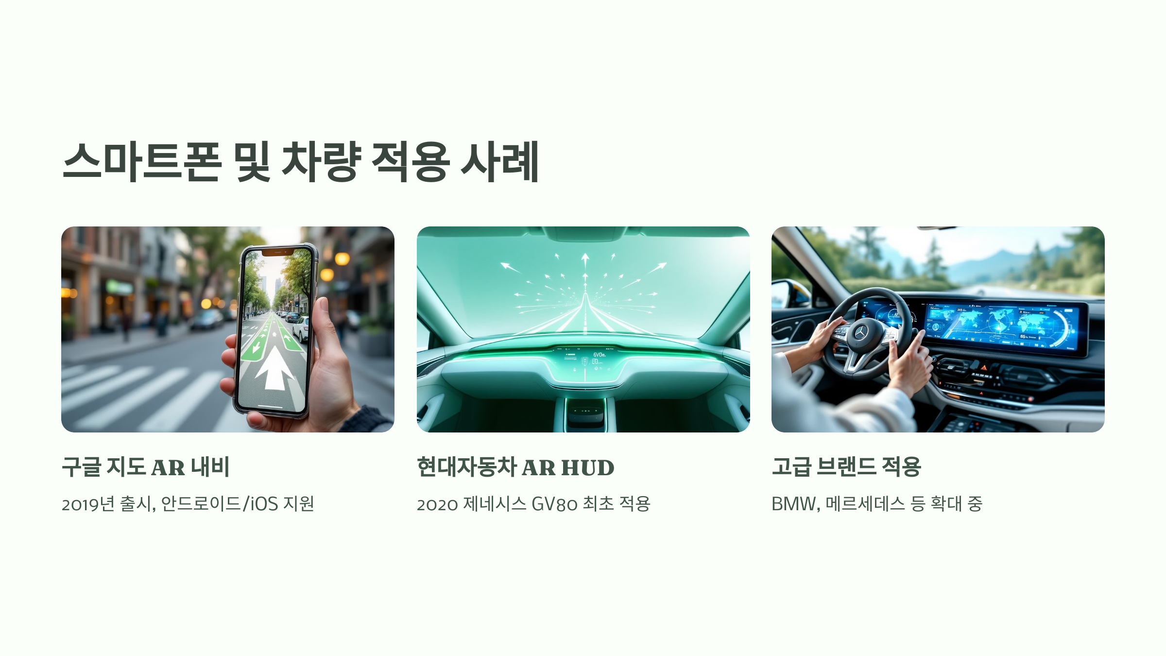 또한 BMW, 현대, 벤츠 등 주요 브랜드는 헤드업 디스플레이(HUD)에 AR 내비게이션을 적용해 전방 유리에 실시간 길을 그려주는 기능을 탑재하고 있어요.