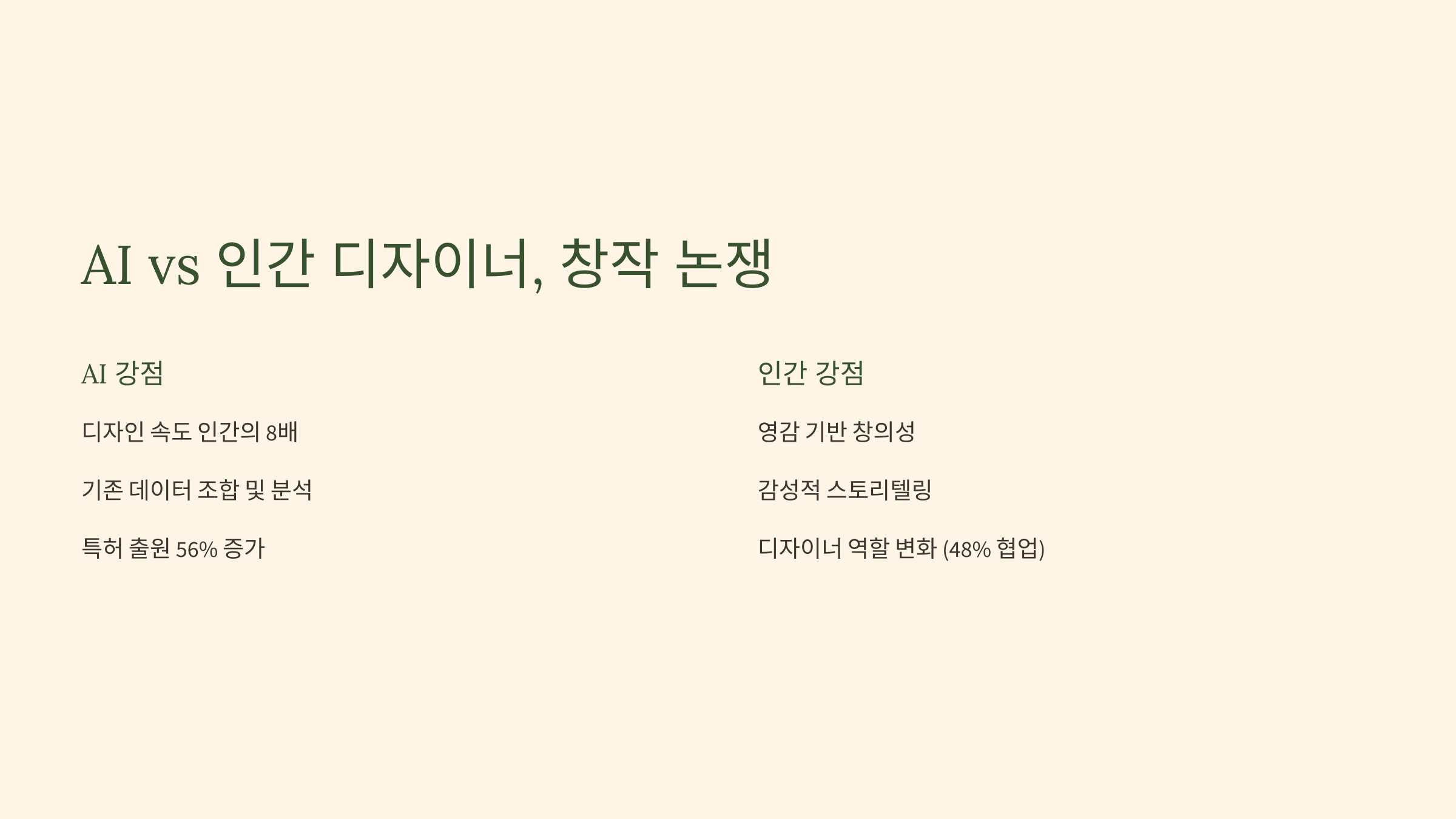 AI는 빠르고 정확하지만, 감성, 브랜드 아이덴티티, 문화 코드는 아직 인간 디자이너가 강점을 가지는 부분이에요. 🎭