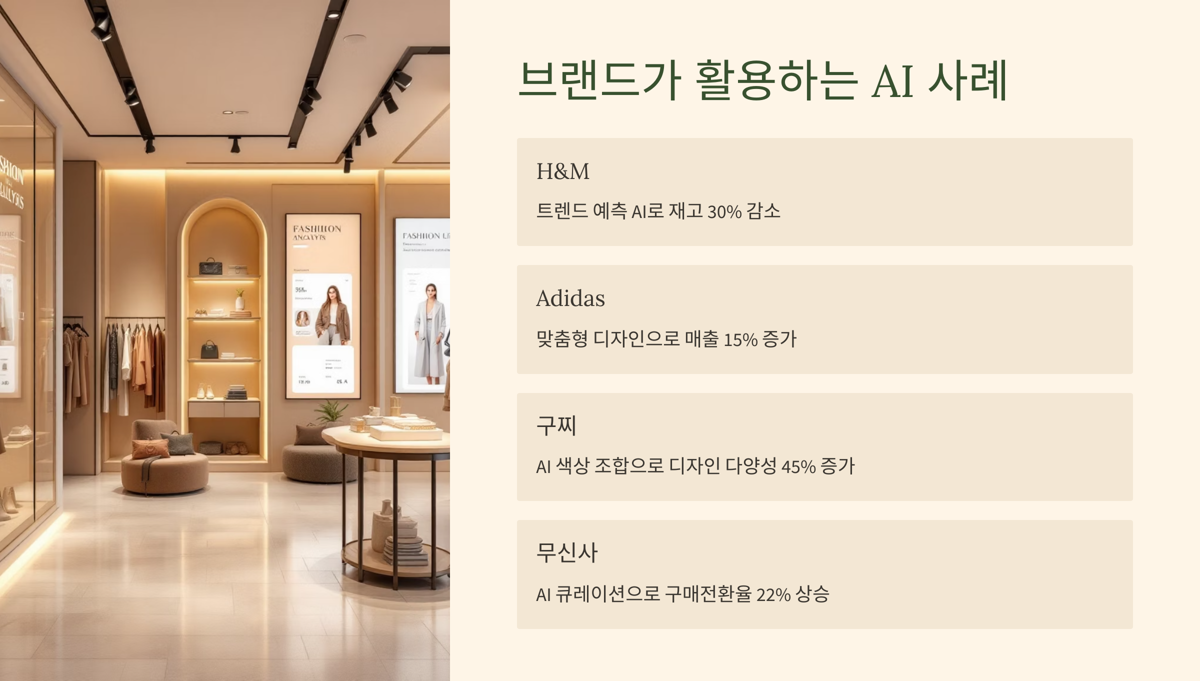 글로벌 브랜드들도 AI를 적극 도입하고 있어요. H&M은 재고 예측에, Nike는 AI 디자인 실험에, Zara는 AI 스타일링에 활용 중이에요. 🏷️